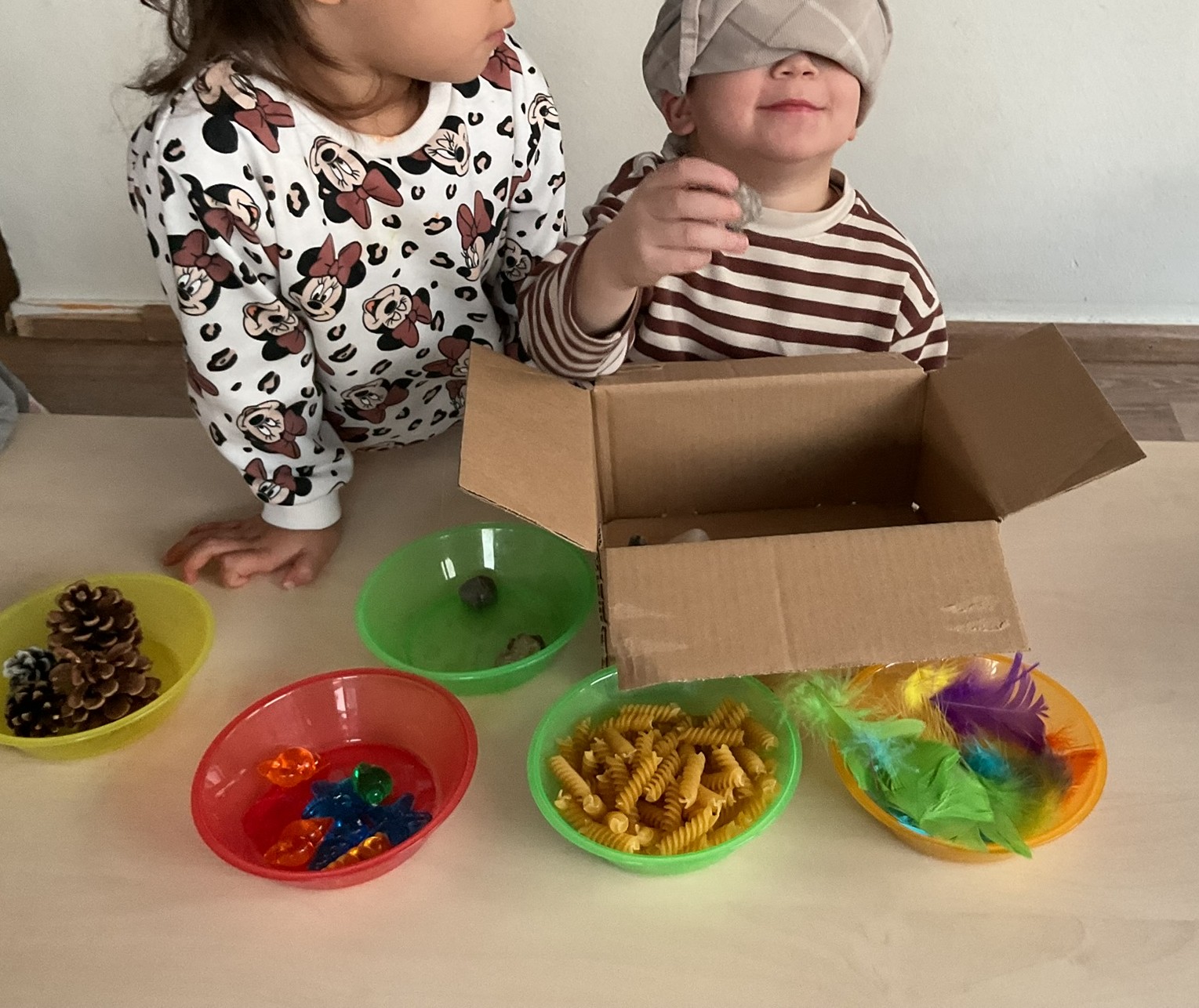 - Voelmaterialen: zachte stoffen, gladde stenen, warm, koud, ruw, zwaar. Zo leren kinderen hun lichaam kennen én grenzen aangeven.